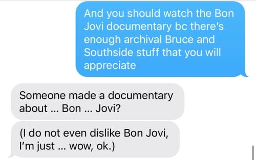 In case you were wondering if one of my takeaways from watching this documentary was that I decided to go listen to some Bon Jovi or if I had a new appreciation for his music or something along those lines: