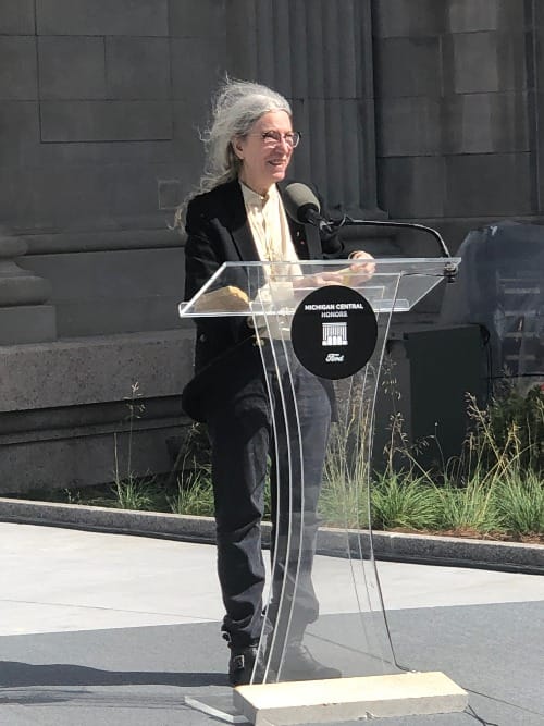 Around 4:30pm, media and guests were gathered in a random corner of the backstage that had some chairs and a plexiglas lectern. The Mayor of Detroit and some Ford honcho presented Patti with her award – the awards are leftover pieces of marble from the train station, with a plaque on them – and then she said a few words.