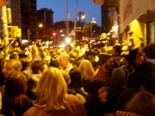 As soon as it was obvious it was over I said brief goodbyes to the people in my immediate vicinity and made my way out. Everyone was pushing forward, wanting something, wanting to not have to leave, wanting to not say goodbye, wanting the evening to not be over. It took forever to get out, and I was almost glad, taking the mental photographs: the bar with its roof and railings that I always tripped on. The canyon of neon signs. The uneven floorboards. The ancient band fliers everywhere. The stickers, likewise. Jesse Malin at the bar. Bob Gruen holding court.