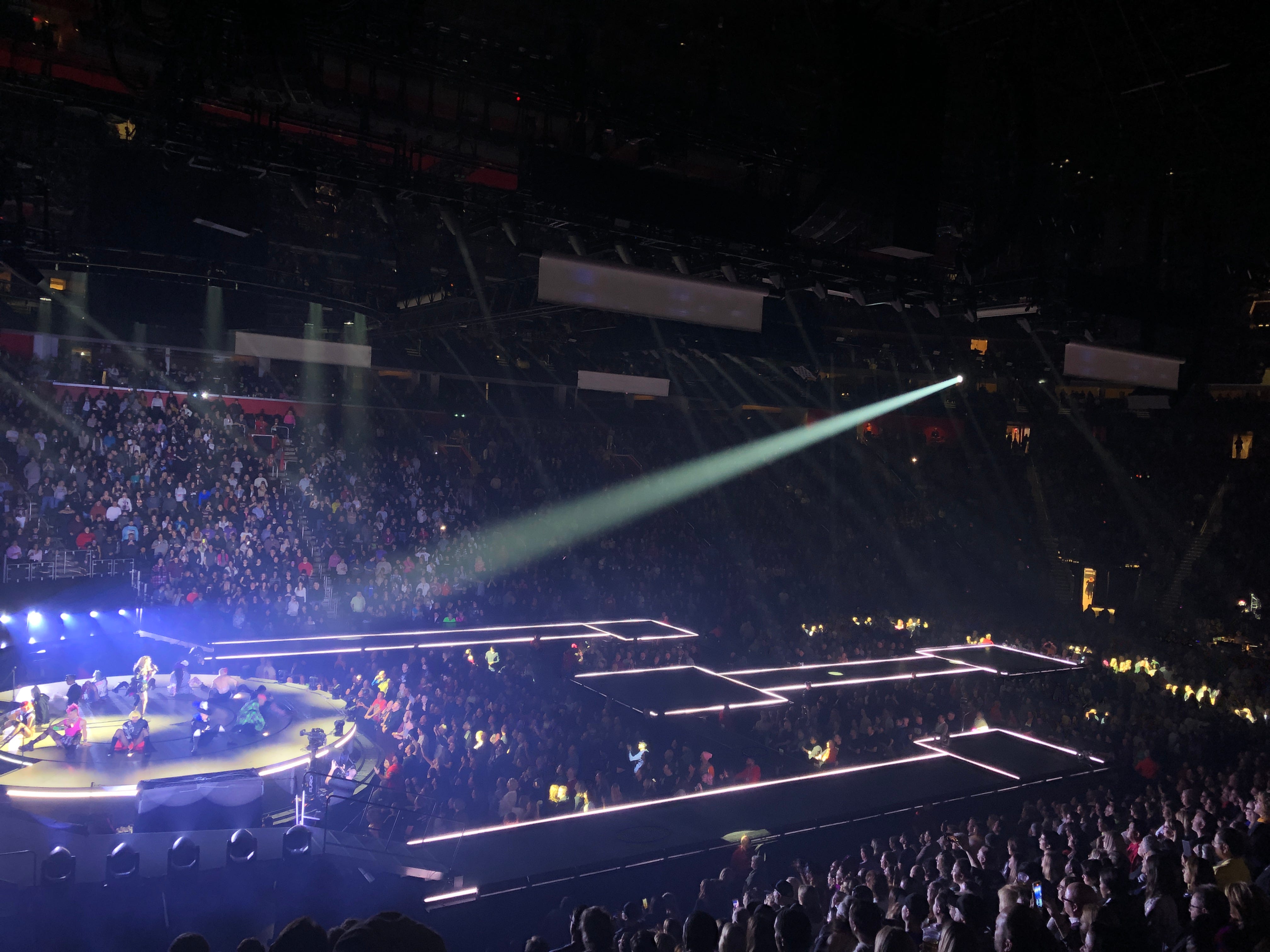 This is the first large non-traditional arena-level stage that I felt was successful at multiple levels. It is “inspired” by the Manhattan street grid. (I will refer you to this fantastic map created by the folks over at the MadonnaTribe fan site for better detail.) There’s a main stage, which is round and has various hydraulic platforms that lift and rotate, and there’s an audience area with chairs directly in front of it. But that’s about as normal as it gets. The rest of the stage is an extending catwalk that intersects and meets at larger b-stage spaces out on the floor. And unlike a lot of artists who use a b-stage concept, this show utilizes every single inch of the space throughout the entire night. It isn’t “two songs on the b-stage, yay” nor is it confined to the star coming down to a platform to perform a song. There were boxing rings, the bed from the Blonde Ambition tour made a cameo on one, there’s a Voguing contest on another. There is also an illuminated box that flies above the audience from the main stage out to the farthest platform which I did not like and did not think Madonna holding on tightly to a rail was sufficient, although folks who were closer assured me she was strapped in tight.