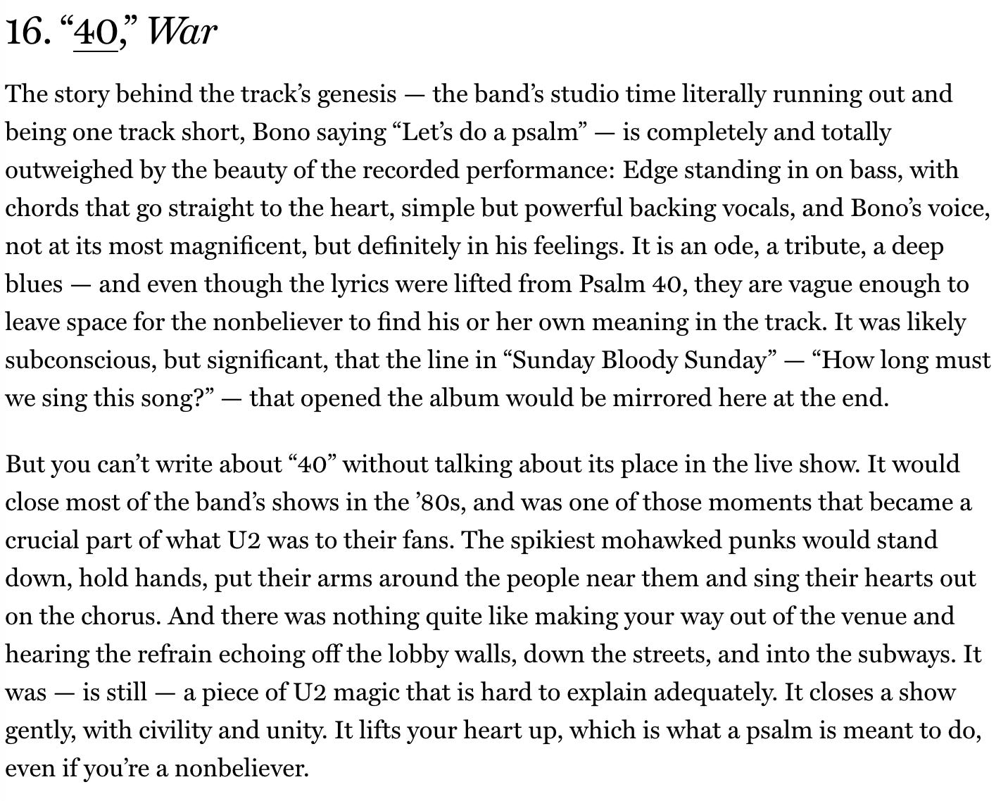 I wonder what these people thought during “40.” They were probably leaving, or at least eyeing the exits. It didn’t matter what they thought, though, because it was over and we were done with this era of U2 and playing “40” for us was their way of acknowledging that they are done and thank you for putting up with this and thank you for showing up anyway. “40” is sacred, it means something, it will always mean something. They play “40” in defiance, without asking permission, without getting approval. A punk rock band from Dublin, Ireland is putting a psalm to music.