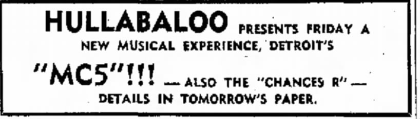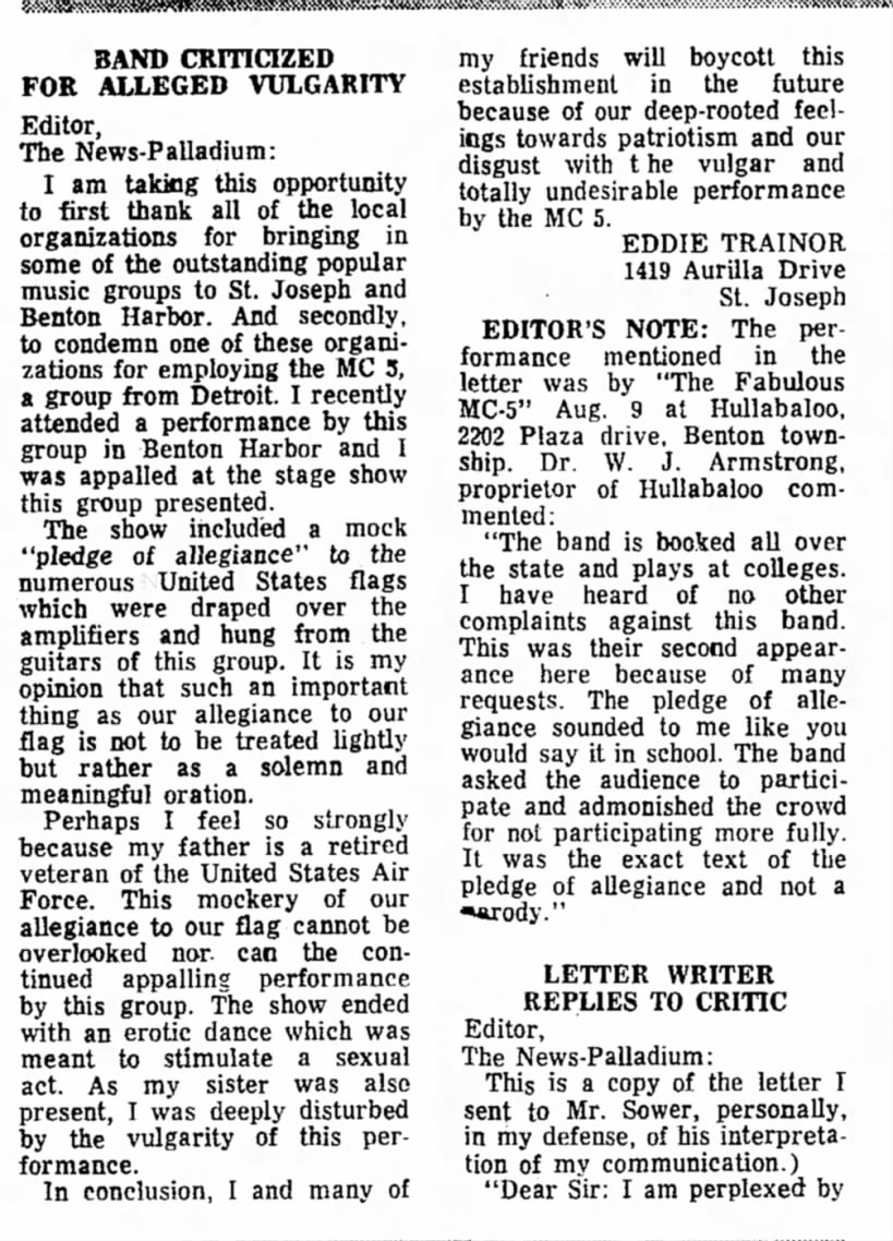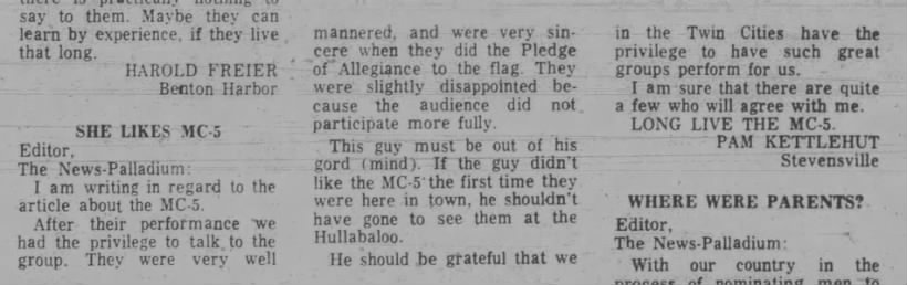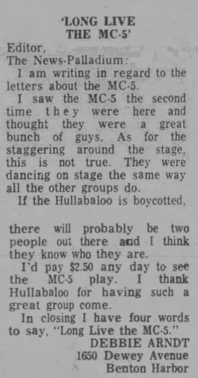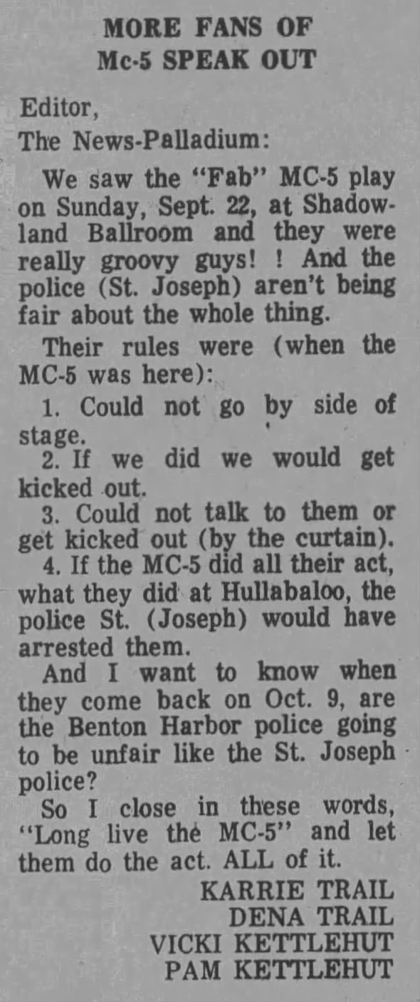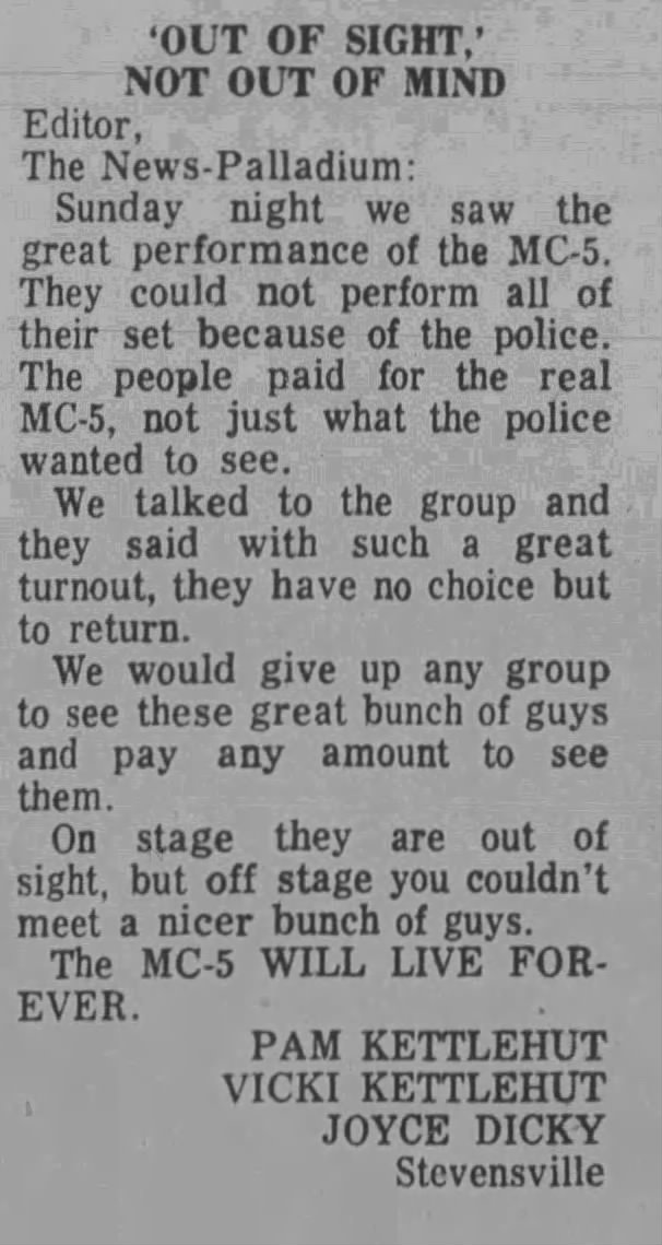 That brings us to this week's research project. Because of the MC5 book I learned that the MC5 and I were actually in the same city multiple times, although I was 5 years old at the time. My family lived in St. Joseph, Michigan, from 1969-1974, and during that time period, the 5 played about half a dozen shows which had great impact on the local populace. In the book, Rob Tyner mentions that the Benton Harbor police passed an ordinance forbidding the band from moving onstage, and while I couldn't (yet) run that down anywhere (trust me that I am absolutely going out there to dig into local archives), I did find a treasure trove of ads for shows as well as letters to the editor in the Benton Harbor Herald-Palladium.