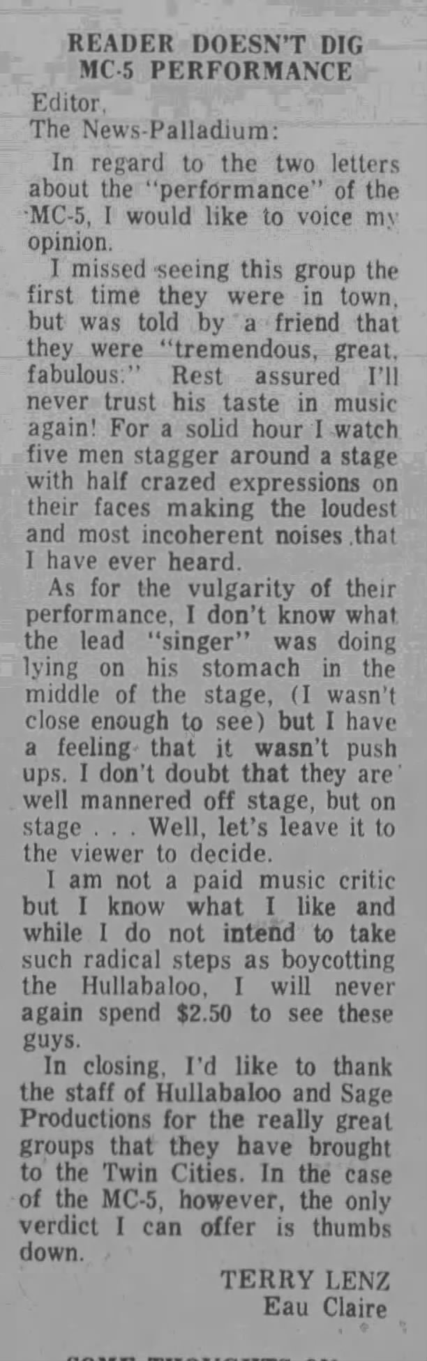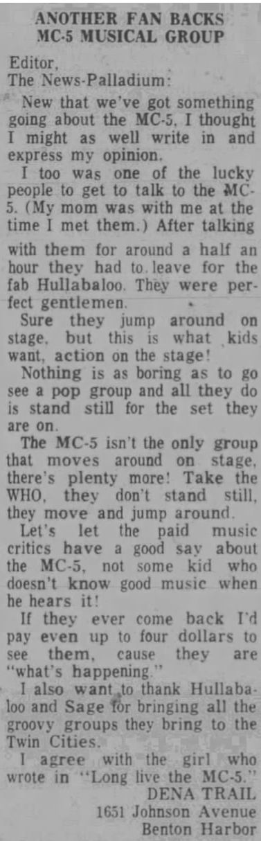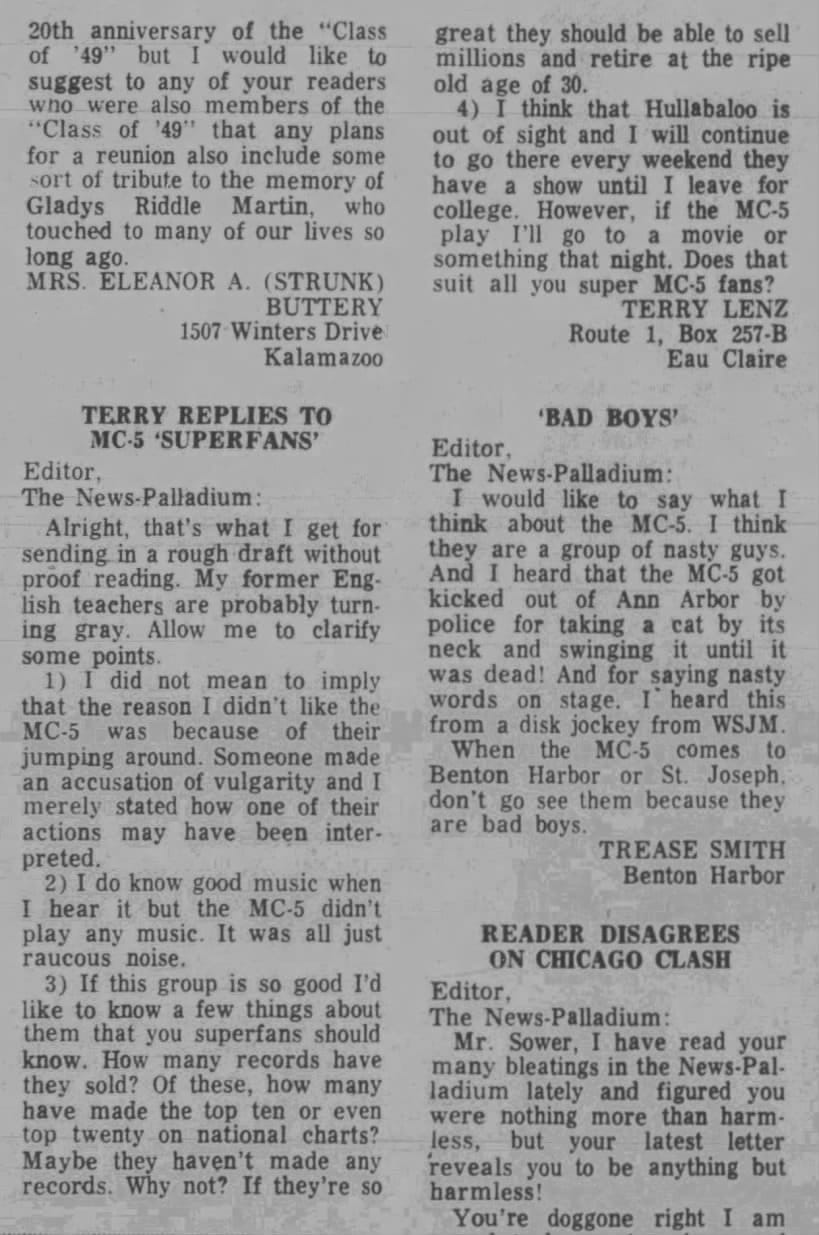 I know that these were minuscule towns and that the daily paper was only too happy to have something that young people were going to be interested in reading. In between the ads for shows and the letters to the editor, the paper also featured every AP story about the MC5 getting arrested, smoking marijuana, protesting the war, and swearing in public.