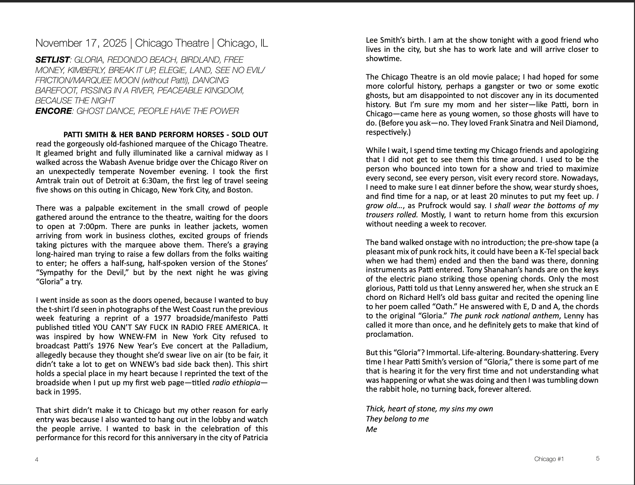 In November, Patti Smith & her Band went out on the road for the 50th anniversary of Horses. I traveled to the shows in Chicago, NYC and Boston, a total of five.