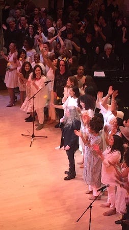 She also worked the house, walking the edge of the stage, making eye contact, rallying the fans in the parquet level to get on their feet (in their defense, the Carnegie Hall ushers are fairly dictatorial in their enforcement of the rules). But finally, everyone is on their feet singing “G-L-O-R-I-A.” And by the last chorus, that final, raucous recitation of her name, the artists from the evening come spilling out from the backstage, spearheaded by the joyous women of the Resistance Revival Chorus spanning the front of the stage and absolutely losing their minds to be singing onstage with Patti Smith, who kept dropping back to pull them on mic to sing a line.