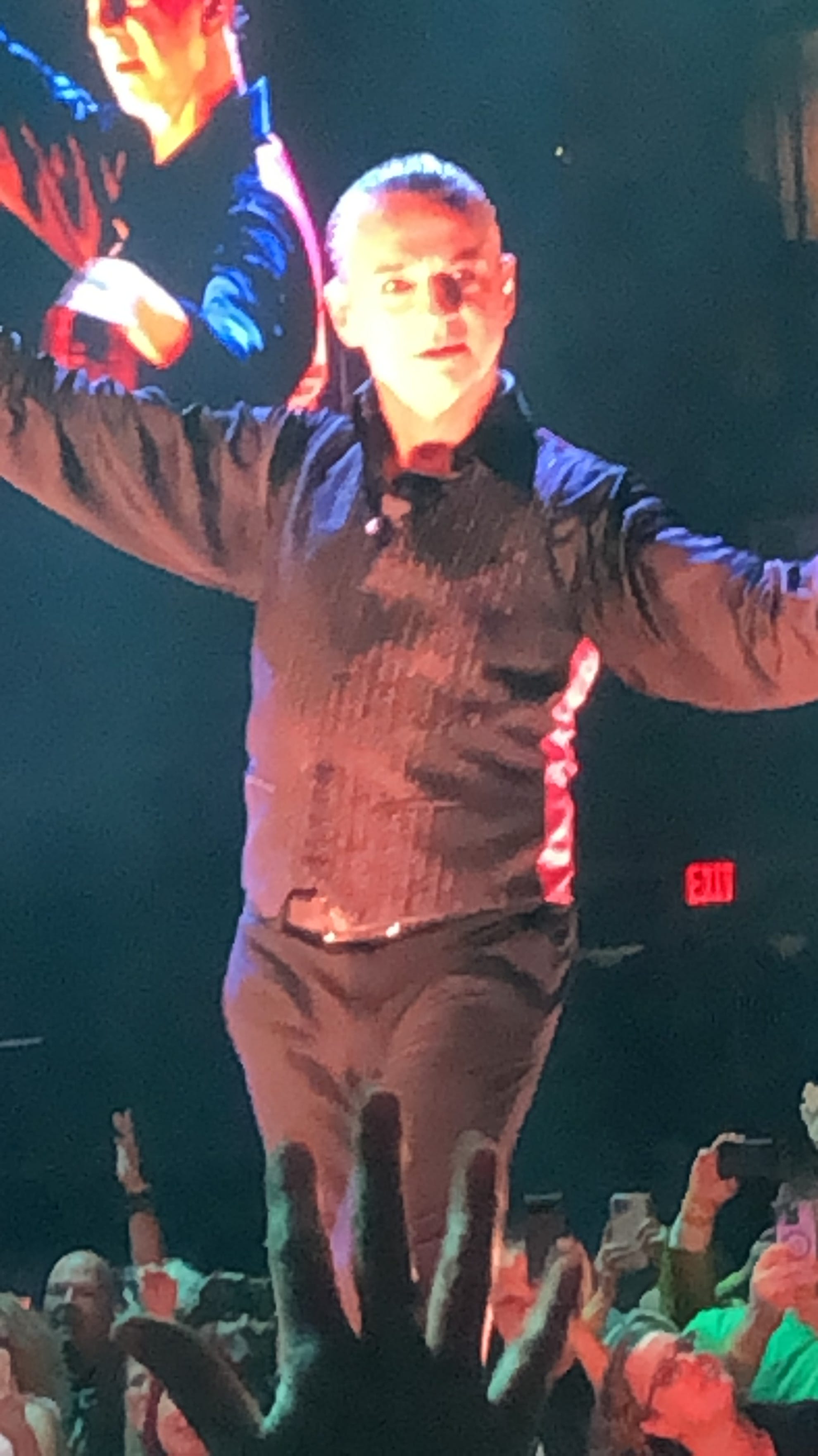 Gahan is now center stage and the band begins the opening song on Memento Mori, “The Cosmos Is Mine.” He’s wearing a tastefully sequined three piece suit that will last just as long as it takes to get to Martin Gore’s solo spot, when he’ll shed the white button-down shirt and jacket for just the ensemble’s vest. He has a series of these with different colored backings, yellow and pink and blue (again, I know all of this because of the algorithm), but tonight is classic black. Gahan’s baritone is deep and rich, with more power than I had ever expected based on what I knew of Depeche Mode and of his various misadventures. He easily holds the spotlight center stage, before moving into action - he spins, he crouches, and he basically stalks the entire length and breadth of the stage at all times all night.