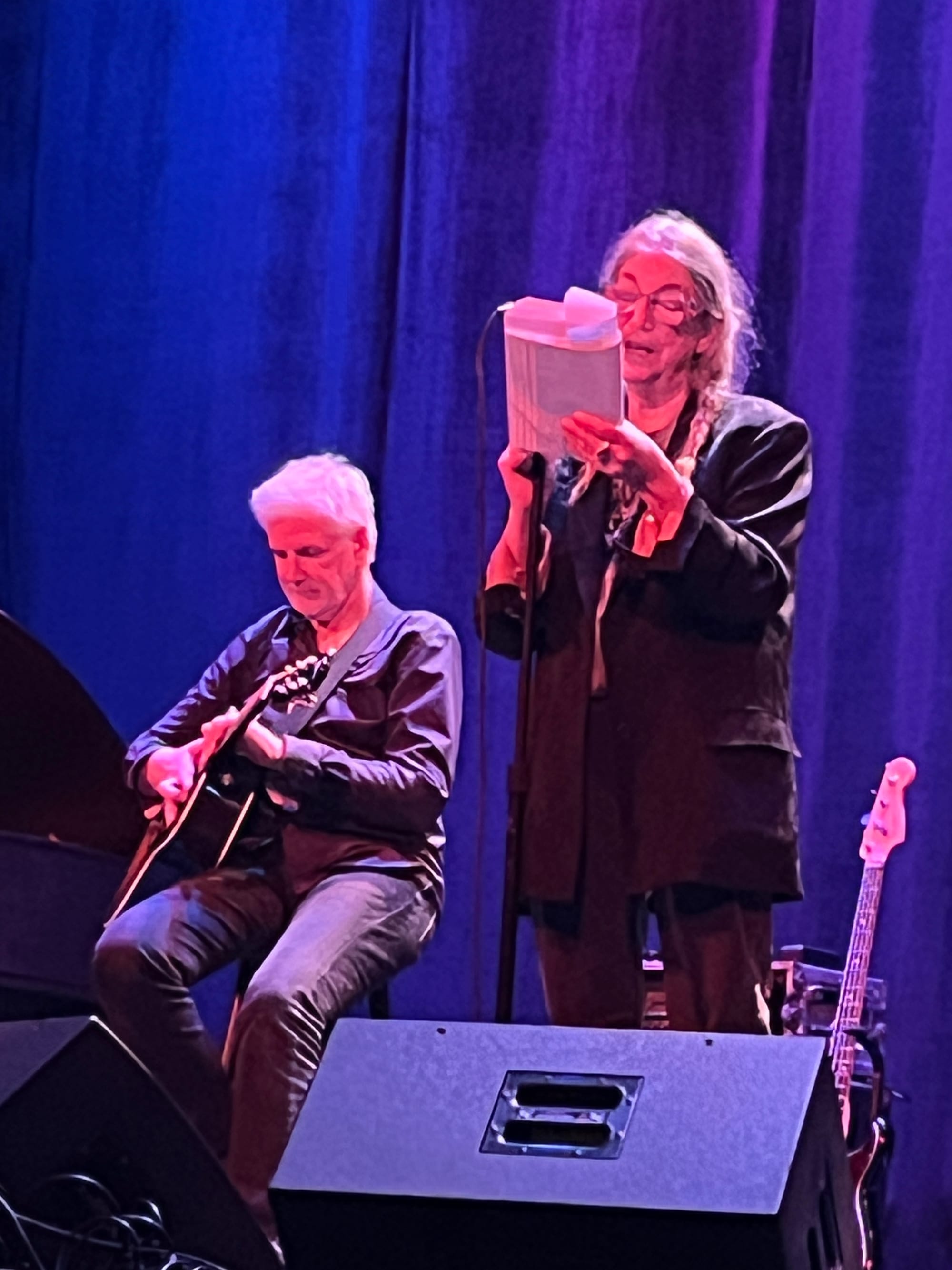 “My Blakean Year” followed, Tony Shanahan’s bass melody dominating the mix — probably not entirely intentional, but it wasn’t a bad thing at all. “Blakean Year” is Patti’s go-to when she does these kinds of events, mostly because she can play it herself solo, but it is as always a gentle reminder that she is always about the work. “Do we have the light situation worked out now?” she inquired after the song’s ending. “I’m trying to look 68,” she offers, before reading from the chapter about Hoedown Hall and the square dances across from their house in New Jersey.