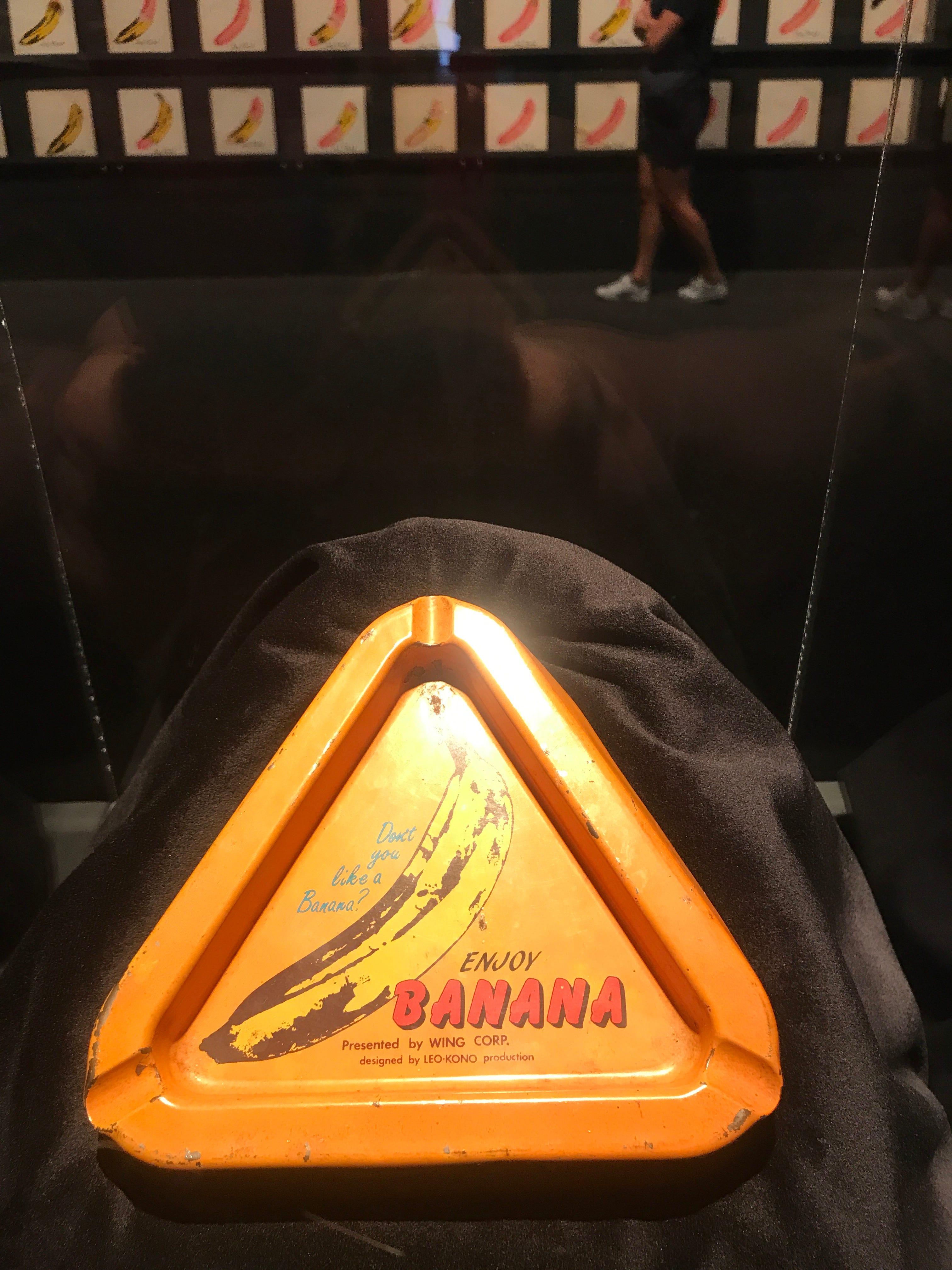 I was also delighted to make the acquaintance of this ashtray, which was the source of the original banana. I stood there thinking, How did I not know about this?? This is not the exact ashtray Warhol worked from, but it is the same image that he chose to use on the cover. This particular ashtray came from the collection of the late Howie Pyro, of blessed memory, and he didn’t even realize what he had until 2017, when he revealed all to the website Dangerous Minds. I’m glad it has its place in the spotlight, and I’m equally glad this wasn’t something I should have known all along. It would have bothered me forever.