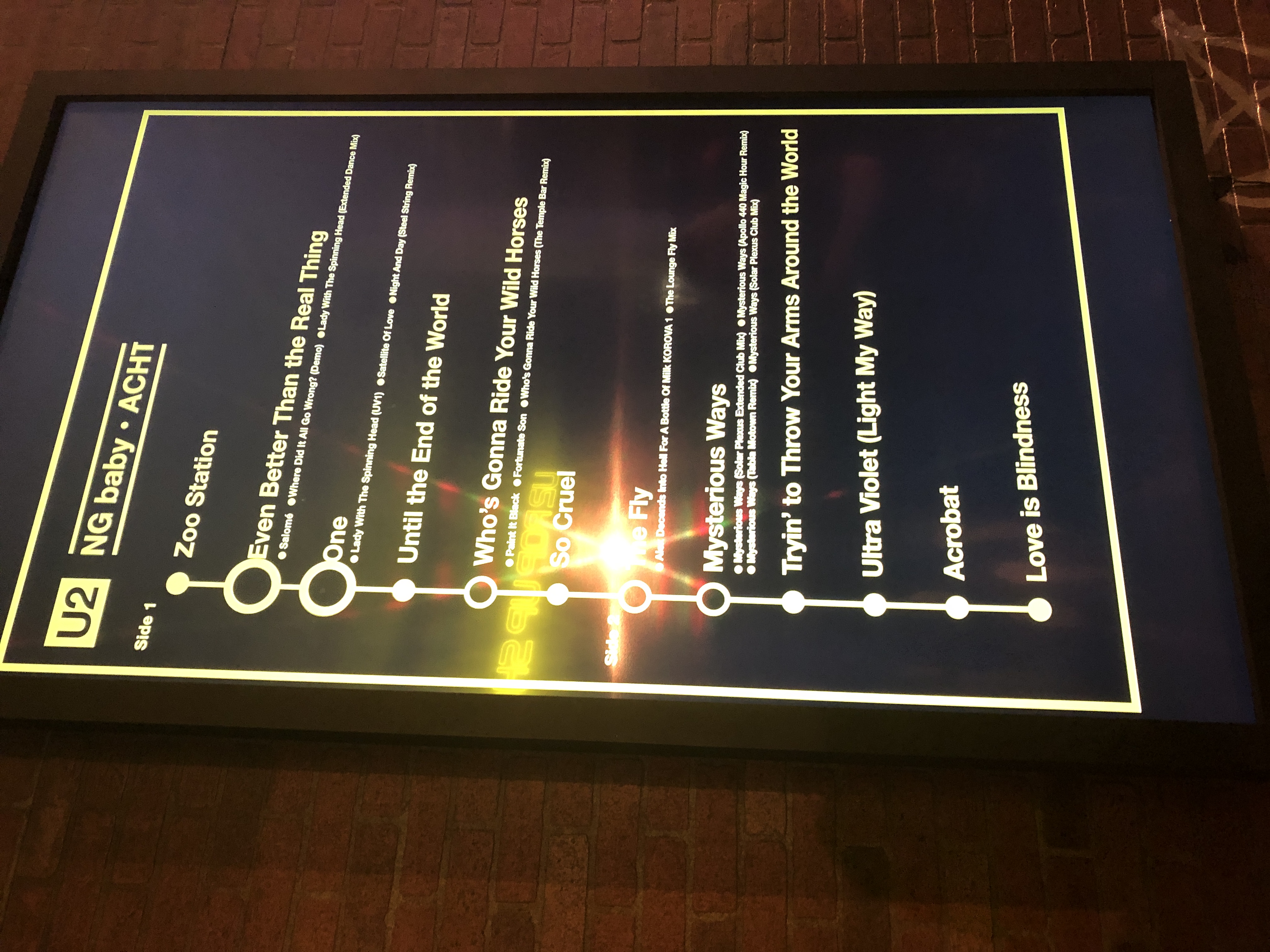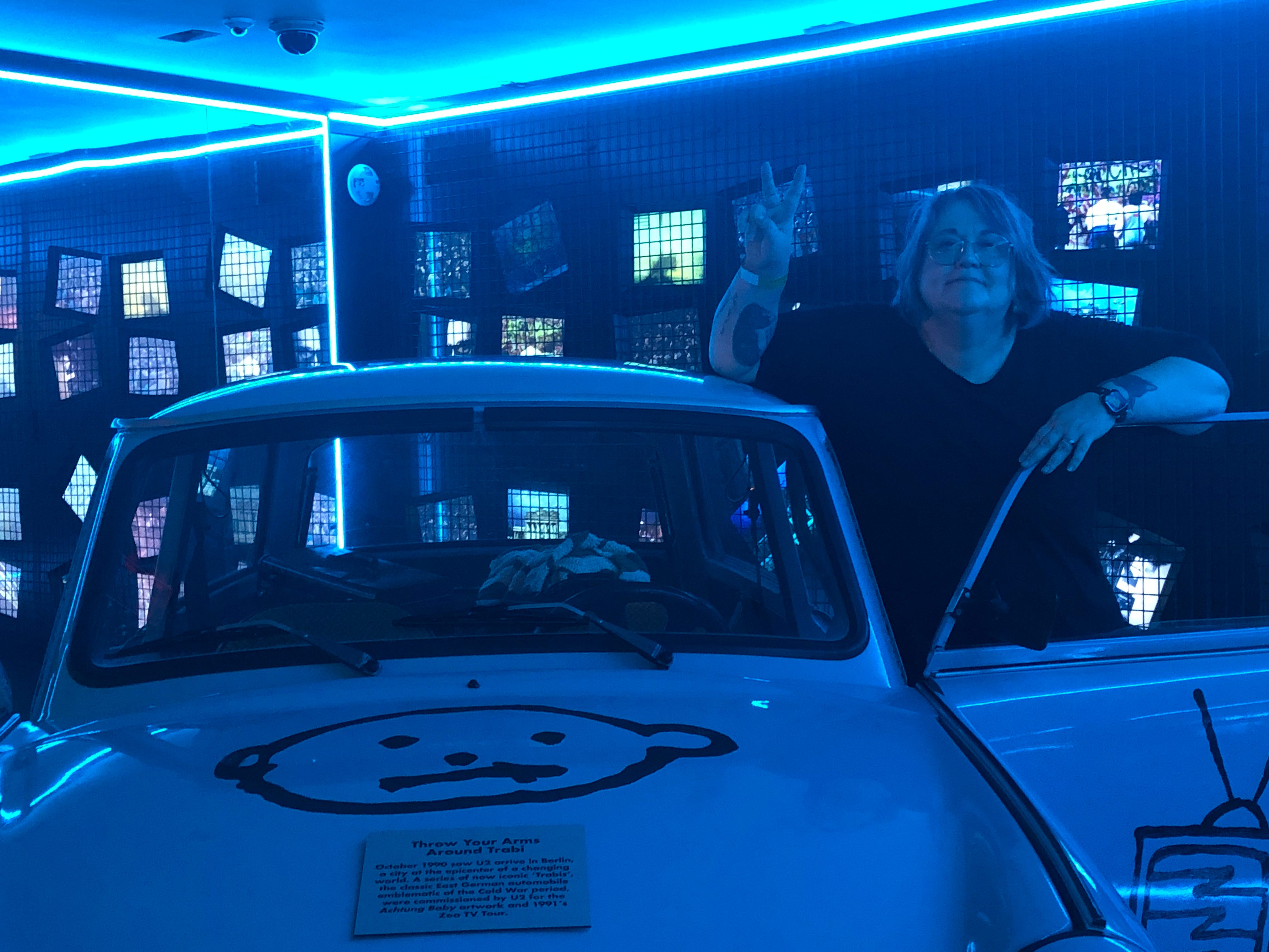 If you don’t know who Anton Corbijn is or why there are people waiting in line to have their photograph taken in a cute little car you are going to shrug and get on the line to buy merch. The Corbijn exhibit is five video monitors with photos that fade in and out. There’s a photo booth, that harkens back to the video confessional that was another one of those crazy “yes and” ideas from ZooTV, a video booth at the back of the floor that you could go into and disabuse yourself of your sins or secrets or just say hi to mom or propose to your girlfriend. But if you don’t know that you don’t know it. There’s a “b stage” with instruments that you get your picture taken in front of but it’s not anything particularly U2 about it? It could be anyone’s stage setup. I refused to do that one but was happy to do the other things because there wasn’t a line. I also did not engage in the exhibit that allows you to “graffiti” a “Trabant” because I was not waiting to do wait however long it would have took for me to get a turn and all I would have done is written LMJ LIVES.