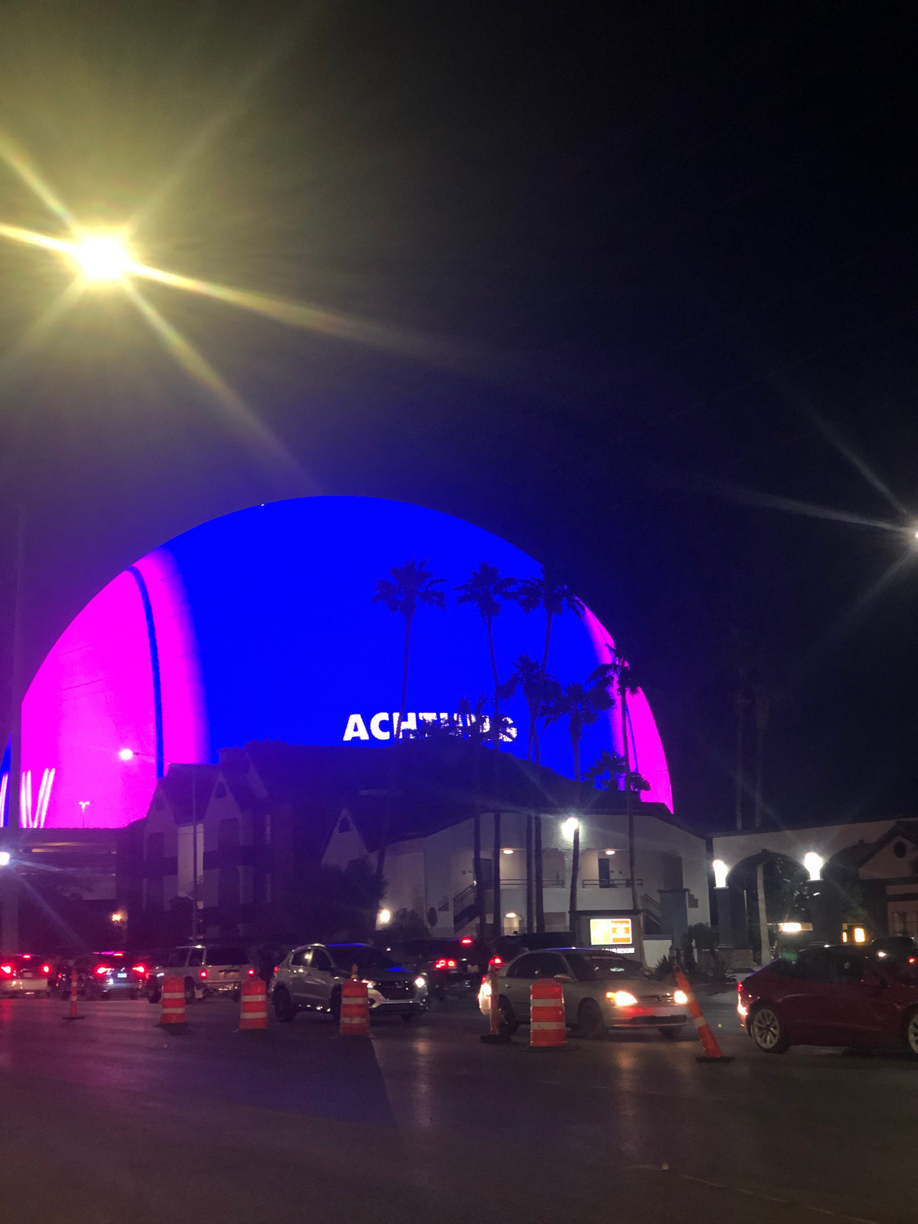 Whatever mainstream promotion J—s D—n has done for the Sphere has been supremely effective: as my flight began its landing approach into Las Vegas the occupants began exclaiming over the bright light city (to crib from Doc Pomus and Mort Shuman) and what was overheard more than anything else was commentary about the Sphere, in its emoji incarnation, bright orange and making faces, smiling and frowning and rolling its eyes. My seatmates took photos; the row behind us discussed that while they weren’t going to attend anything at the Sphere, they definitely planned to go check it out, while other passengers expressed disappointment that they couldn’t see it. Considering that all there is to see is a large illuminated ball adjacent to empty asphalt lots and an employee parking garage and it requires 20 minutes’ walking from the closest hotel, it is yet another chapter in the version of the American success myth of “build it and they will come.” In a line that got edited out of my NPR essay, I called it a benevolent behemoth. I still think it is so incredibly dumb.