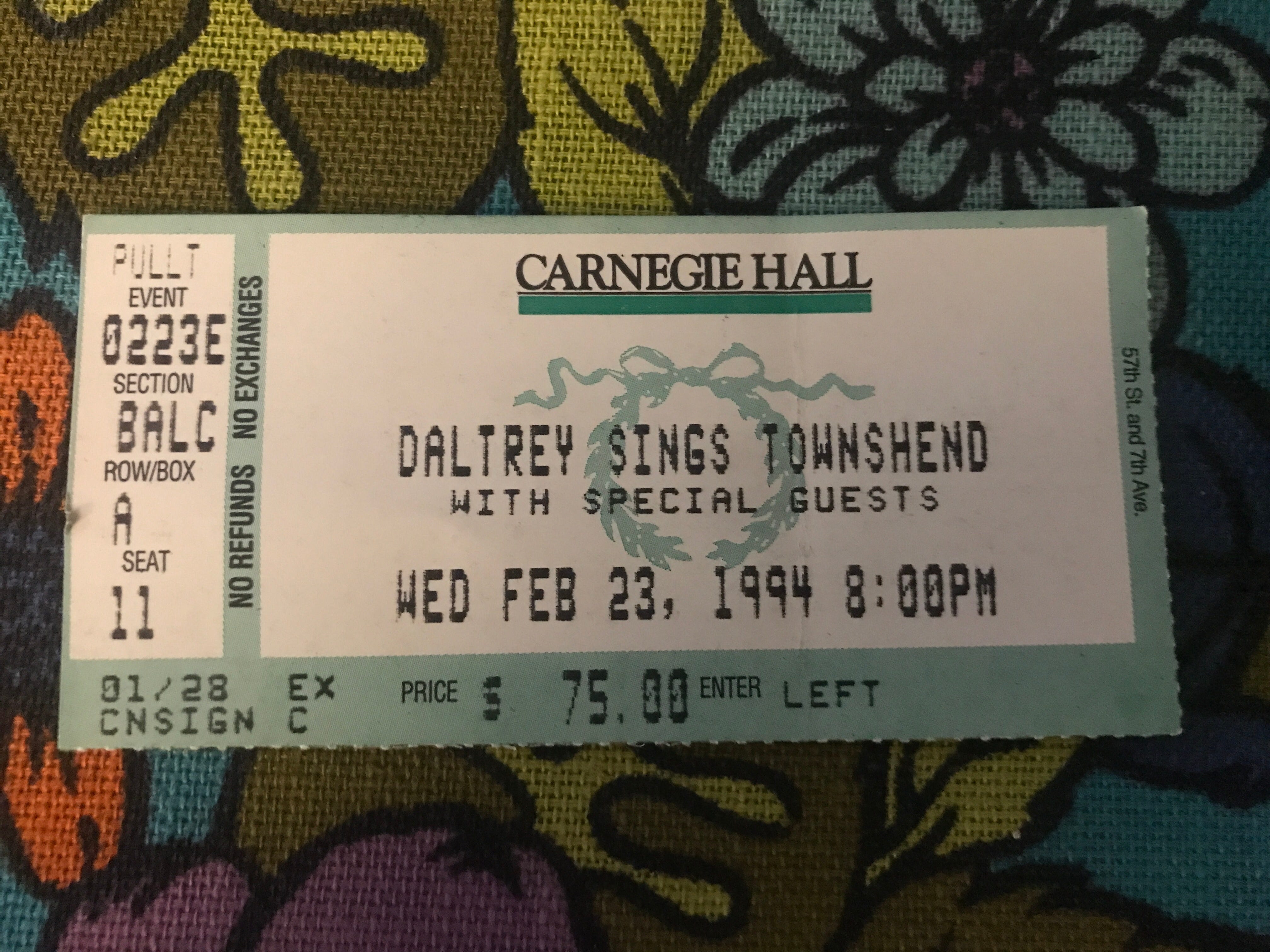 I had just returned to the States at the end of December 1993 (after having been gone since 1988) and the day these tickets went on sale, I was at a job interview, after which I scurried down 57th Street in job-interview shoes and clothes which were not ideal for standing in a lengthy ticket queue outside in January. The ticket sale was a mess -- there’s an article that states it was the fastest-selling show in Carnegie Hall history but I need to fact check that given what other rock and roll shows have been at Carnegie Hall. But if it did sell quickly, it is because the tickets were purchased by scalpers, because I did not get a ticket and neither did anyone else I know. Roger or his people heard about this, and arranged to make tickets available to fans via a friend I used to work with on a Who fanzine. This was how I ended up in the second row on night two (footnote and you can see me in the DVD footage to the point that it is honestly embarrassing) -- I could have sat there night one but I instead sat in the balcony and let someone who could only go the first night have that prime location. I believe cost was also a factor in that this was a benefit and the tickets were not free; the balcony seat, as you can see above, was $75 in 1994 money. I was honestly just thrilled to be there given that I had not seen them since the First Farewell Tour in 1982.
