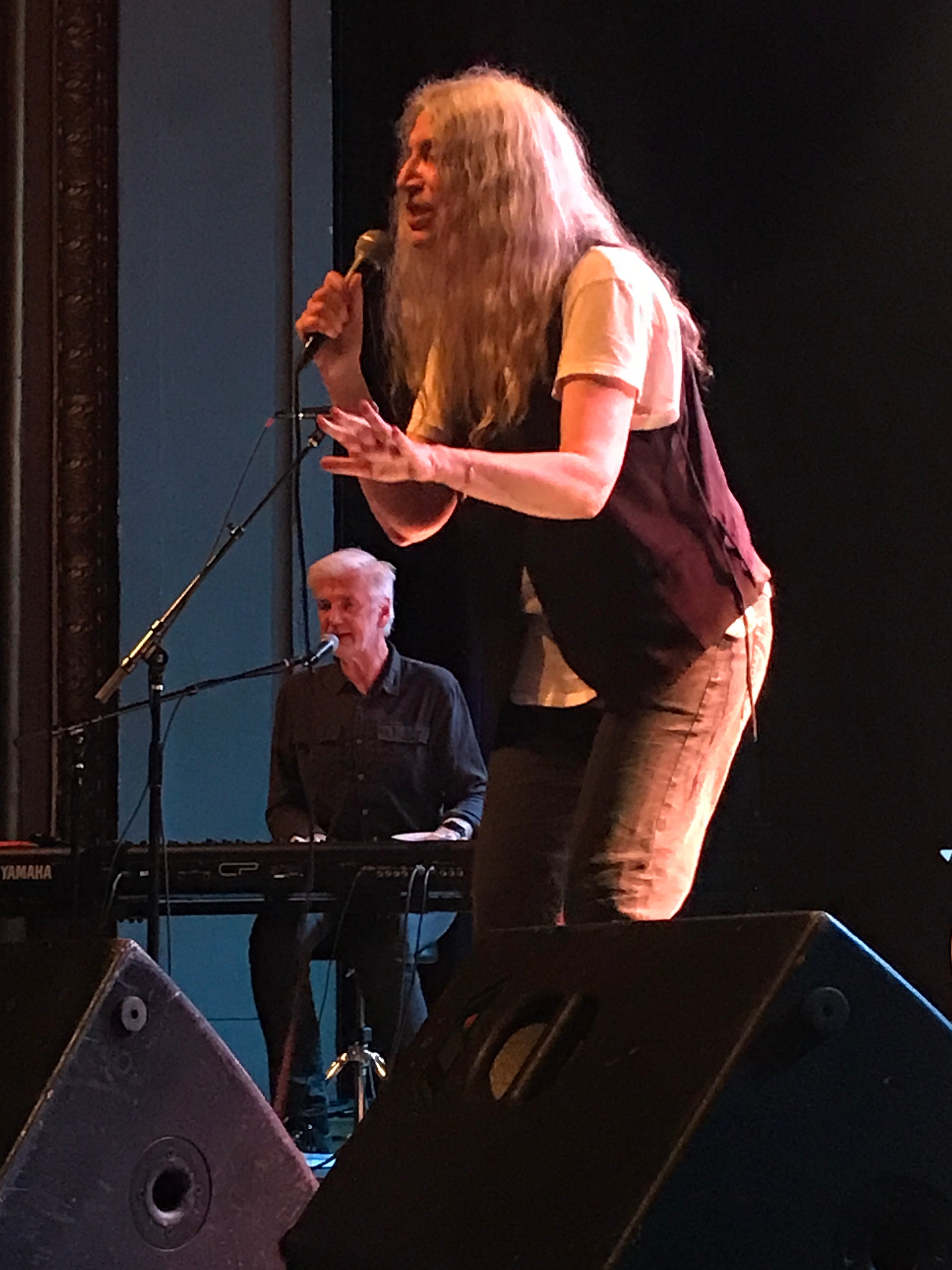 If you’ve seen Patti Smith in any sort of acoustic or solo or here’s Lenny, we’re gonna play a few then you know what you’re likely to hear: “My Blakean Year,” “Grateful,” “Ghost Dance,” maybe “Dancing Barefoot” and possibly, depending on the situation, “Because the Night.” The first three easily translate into limited instrumentation because they’re acoustic-guitar-based, and the latter always works because of the amount of sheer joy Patti always infuses into it, encouraging the audience to sing along at the top of their lungs on the chorus. These regulars had additional oomph because although Patti did play acoustic for about half the set, she wasn’t the main or only instrumentation, so she could focus on her vocal performance. I’m not at all alleging that she doesn’t do as good of a job solo - she always brings a diligence that continues to abash me - just acknowledging the space the trio format brings to these setlist stalwarts.