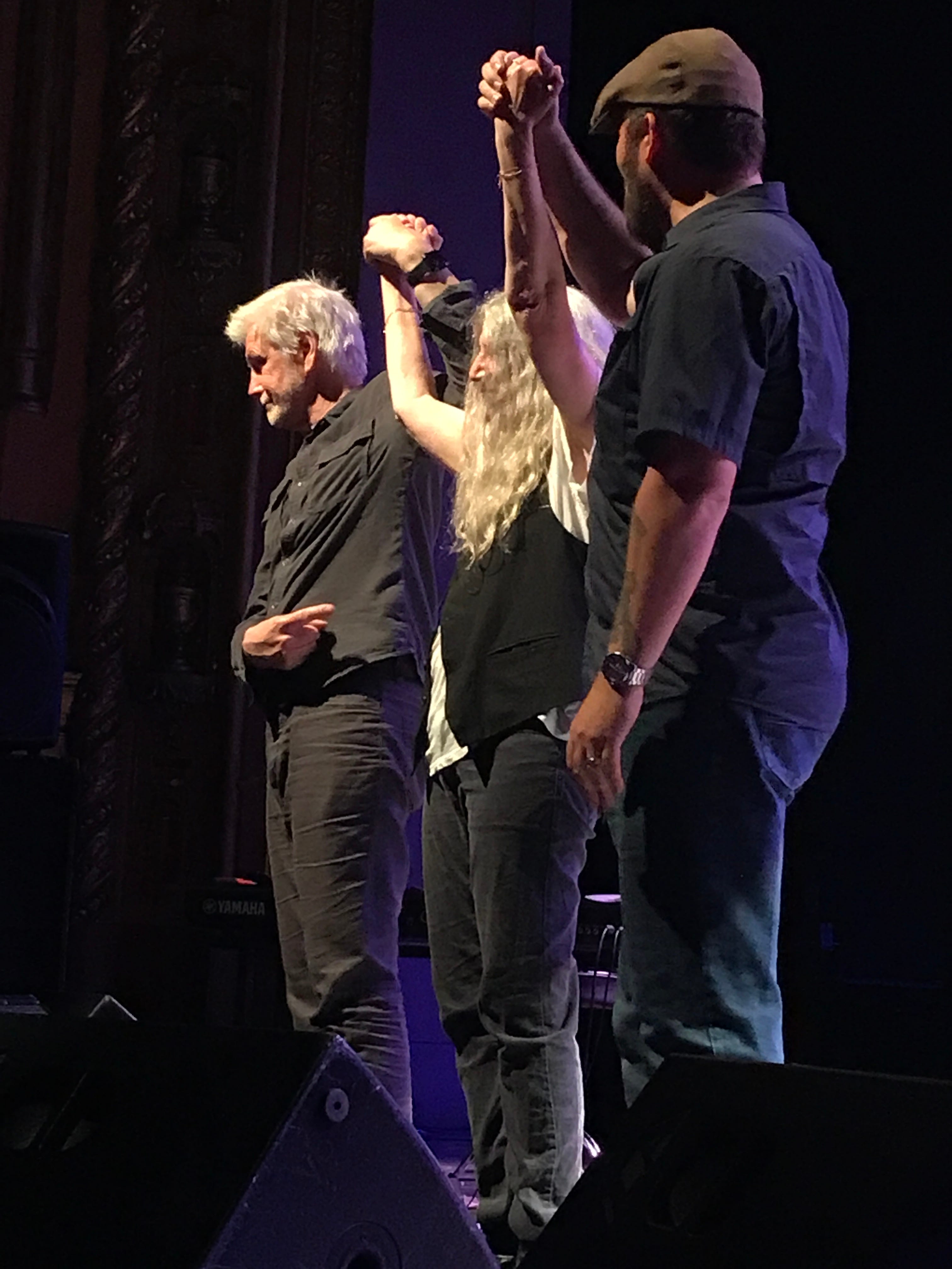 “It Makes No Difference” is always heart-rending, the Band specialized in heart-rending, and this rendition was touching and perfectly executed, the audience holding their silence until the chorus when many of us quietly sang along. It broke my heart to hear that we’d lost Robbie and I knew I could count on Patti to acknowledge his passing in a way that would be genuine because it is a loss to the musicians onstage as much as it was to those of us in the audience. When you’re walking through a world that devalues art or at least doesn’t take it seriously, you want to be able to share your grief or feelings with others who feel the same way you do, and you usually don’t have anywhere else to do it besides a rock and roll show, which is why these kinds of tributes are important. This one was.